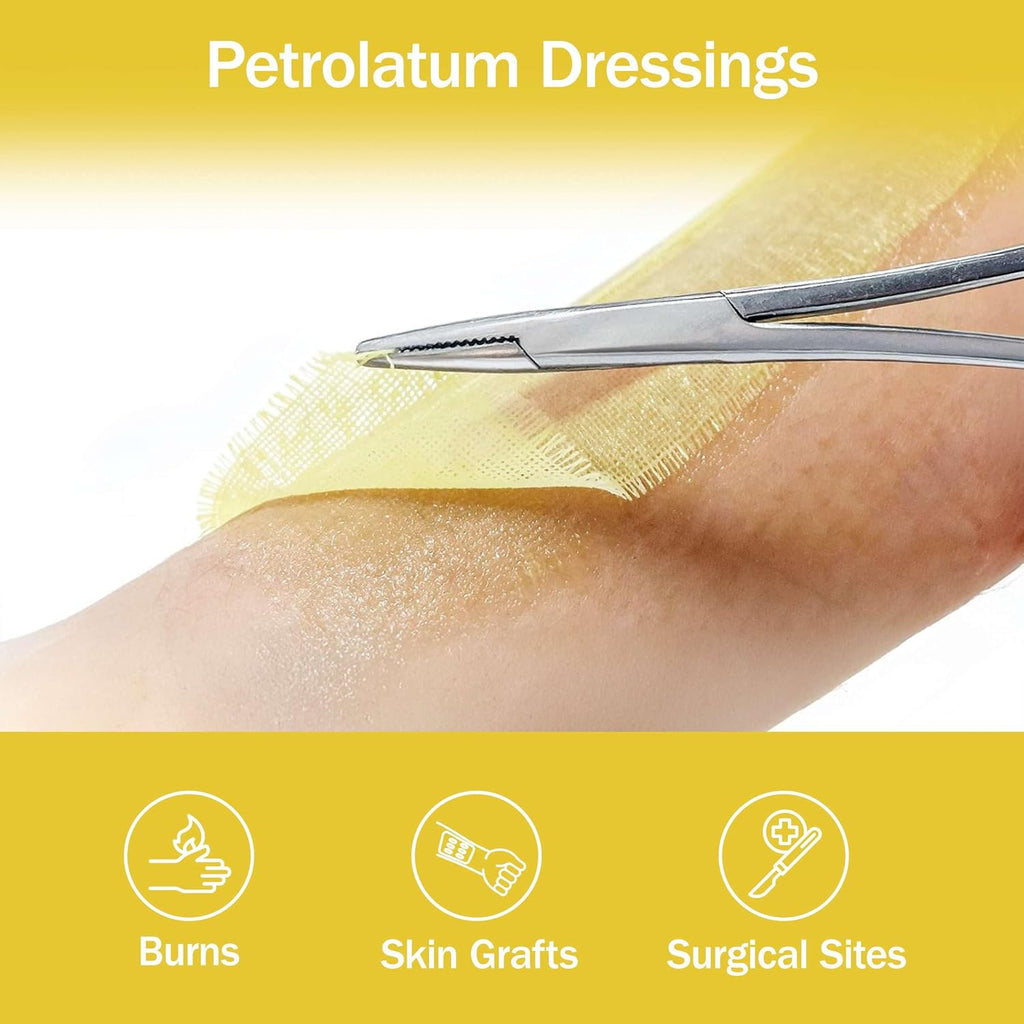 Non-adherent petrolatum gauze dressing for wound protection and moisture maintenance.